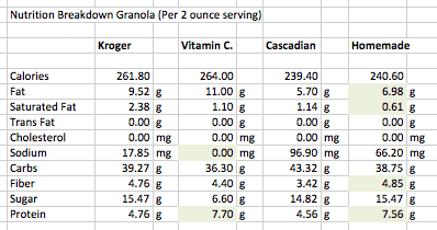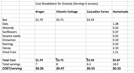Not bad! Kroger beat me in per serving costs, but that’s to be expected I think. I destroyed the other two brands. If you don’t think 14 cents per serving is substantial (me versus Vitamin Cottage for example), imagine this: Betsy and I probably both eat 1.5 servings per day for breakfast. That works out to about $25 bucks in savings for us every year if we made homemade rather than buy that brand.